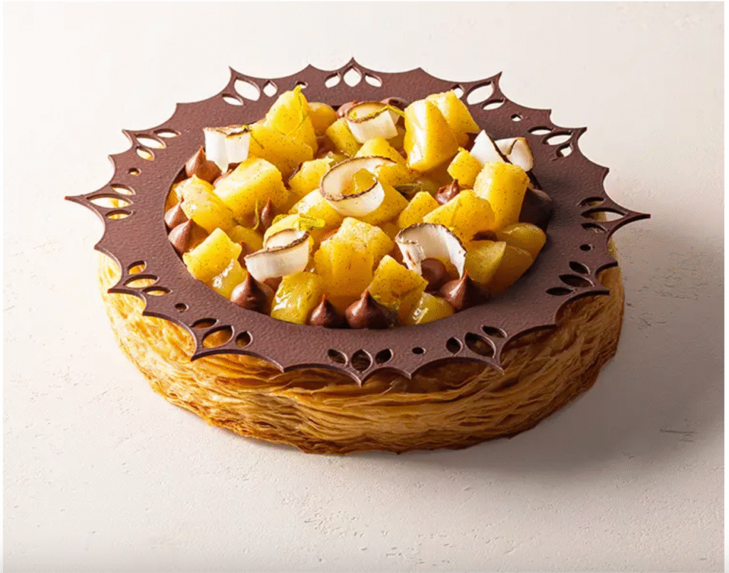 Le chef pâtissier Nicolas Cloiseau signe cette année une galette lumineuse et élégante. Surmontée d’ananas rôtis à la vanille, de copeaux de noix de coco et de zestes de citron vert, elle offre une explosion de saveurs exotiques parfaitement maîtrisées. Son disque de chocolat et son feuilletage croustillant, finement caramélisé, apportent profondeur et texture à l’ensemble. Une création solaire où le fruit rencontre le croquant avec une justesse remarquable.