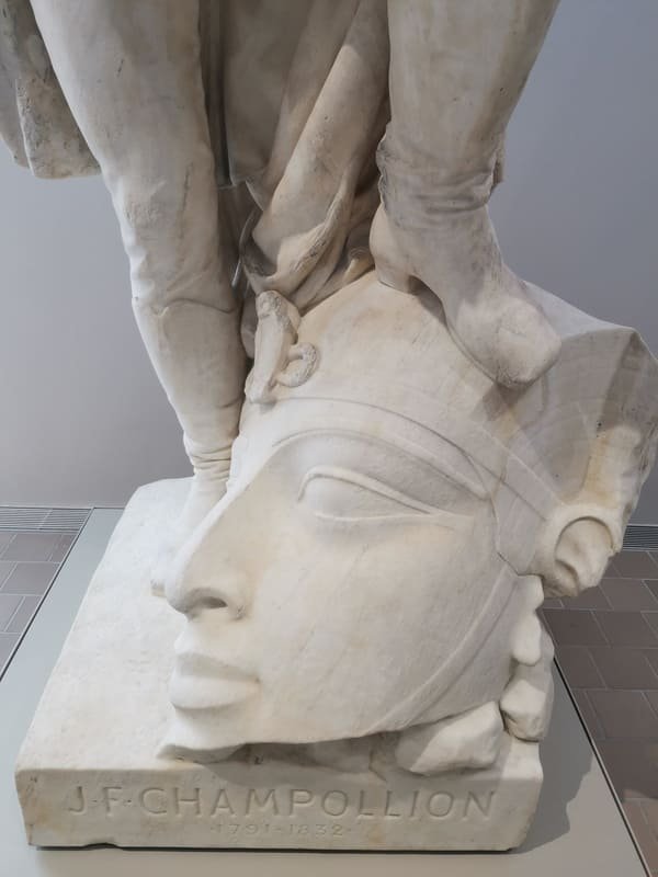 Bartholdi représente Champollion en héros moderne, à la manière d’un Œdipe triomphant : le savant, drapé d’un burnous sur son costume bourgeois, pose le pied sur une tête de sphinx, incarnation de l’énigme enfin résolue. « J’ai voulu rendre Champollion comme Œdipe arrachant au sphinx son secret », écrivait le sculpteur en 1867, explicitant une métaphore qui, à l’époque, allait de soi.