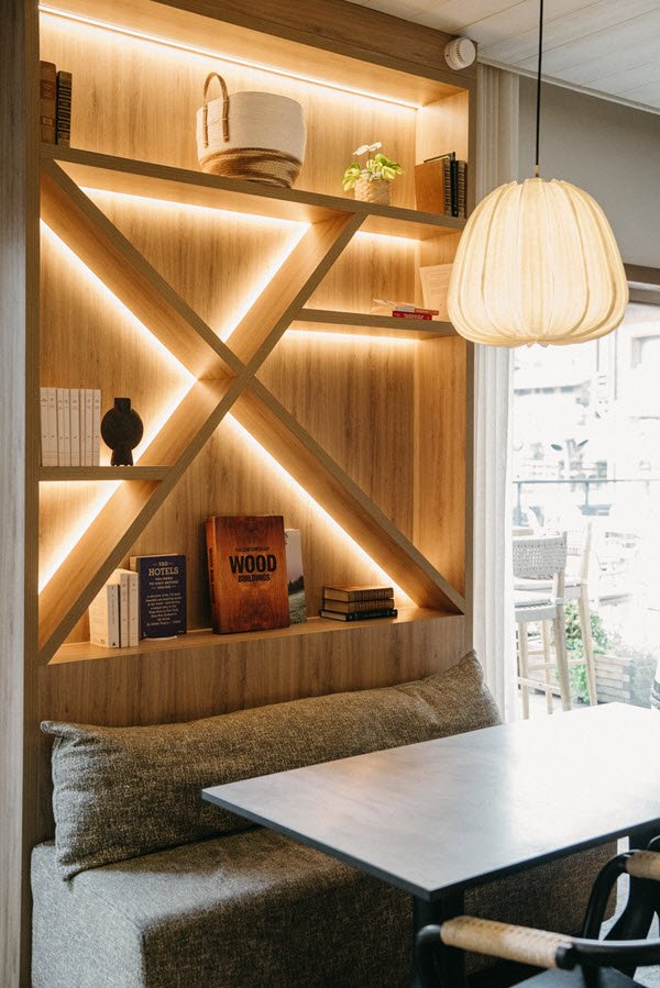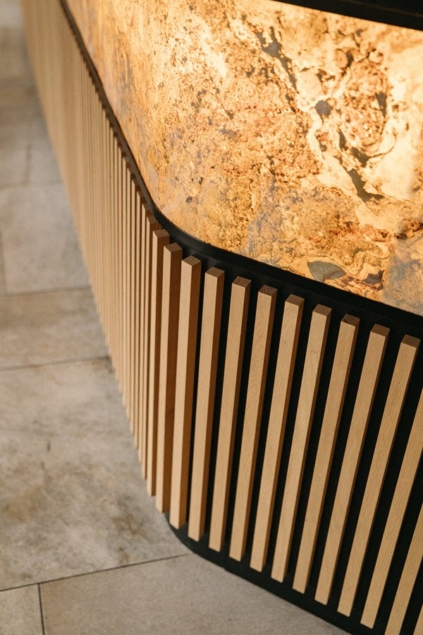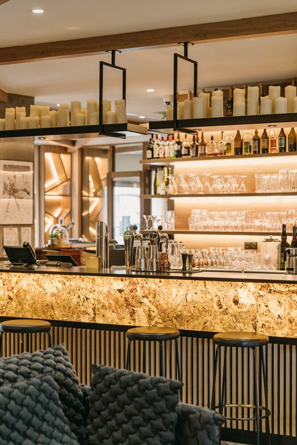 Dans le bar, pièce maîtresse du lieu, le comptoir en pierre de Turquie s’illumine à la nuit tombée, tel une veillée chaleureuse après une journée sur les pistes.