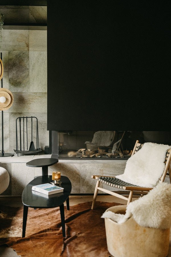 Céline Moscheni Tournaire a orchestré des intérieurs où le matériau devient poésie : la pierre brute, les bois blonds, le chêne noble, les fourrures douces rappelant les chalets d’antan.