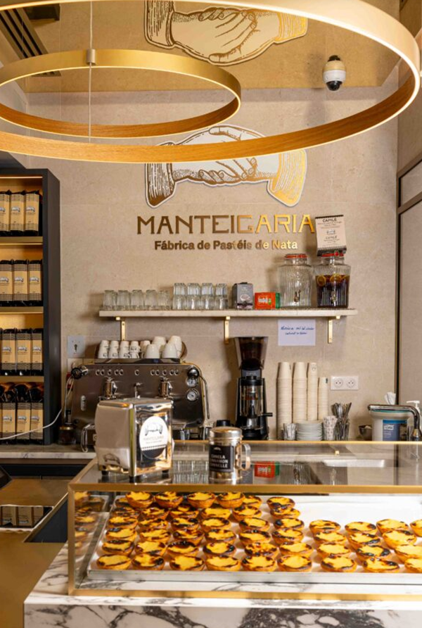 Les adresses de Manteigaria partagent un même écrin : une large vitre sépare l’espace client de l’atelier, offrant le spectacle des maîtres-pâtissiers à l’œuvre. Les plans de travail en marbre portugais d’Estremoz, les lambris en marbre de Lioz et les touches de verre doré composent un décor des plus plaisants.