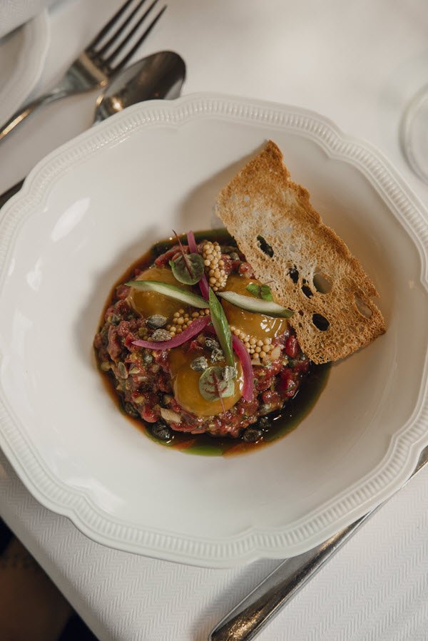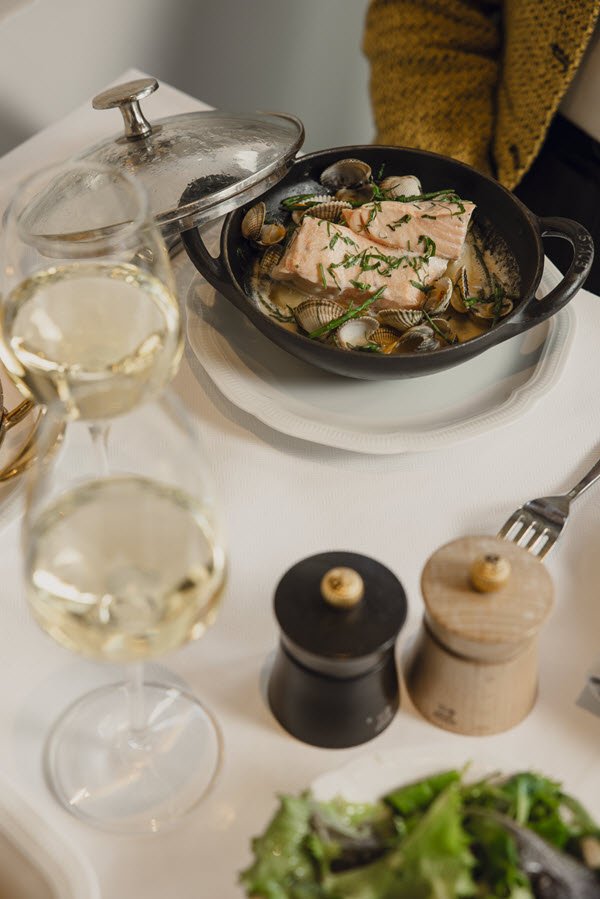 Soupe à l’oignon, gougères Molière ou escargots de Bourgogne ouvrent le bal, suivis de plats emblématiques — tartare de bœuf, saumon confit ou sole meunière flambée. En dessert, place aux grands classiques : Paris-Brest, crème brûlée ou crêpe Suzette flambée.