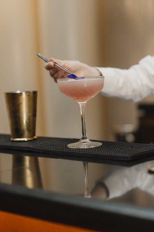 Un mocktail pétillant aussi élégant que créatif, aux notes de pamplemousse rose, framboise et romarin, ponctué de jus de citron, d’un trait de vinaigre balsamique et d’une fleur de pensée, pour une touche couture. 17 €.